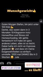 Dabei hatte ich nicht an Hypnose geglaubt und dass ich meine Essgewohnheiten so einfach umstelle. 1000 mal DANKE! Bis in 3Wochen